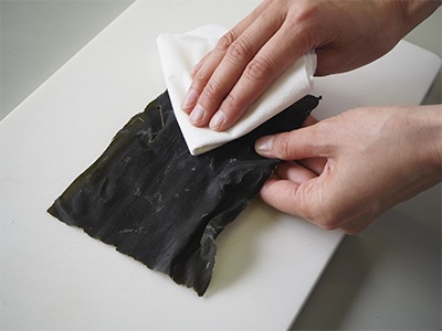 鰹節が沈み始めたらペーパータオル・ネル地などで静かにこす。