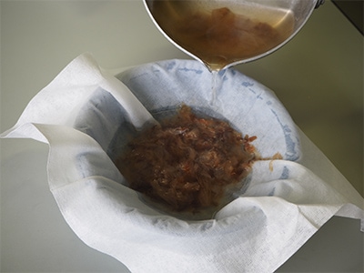 鰹節が沈み始めたらペーパータオル・ネル地などで静かにこす。(※自然に水気を切るようにする。絞ったりすると、カツオ特有の臭みが出たり、濁りの原因になったりする。)