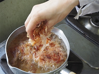 花かつお60gを手でほぐしながら、一度に加える。さし水によって、再度沸騰するまでの時間が10秒くらいになるのがよい。長時間煮出すと香りが飛んで、渋みや酸味が出てしまう。